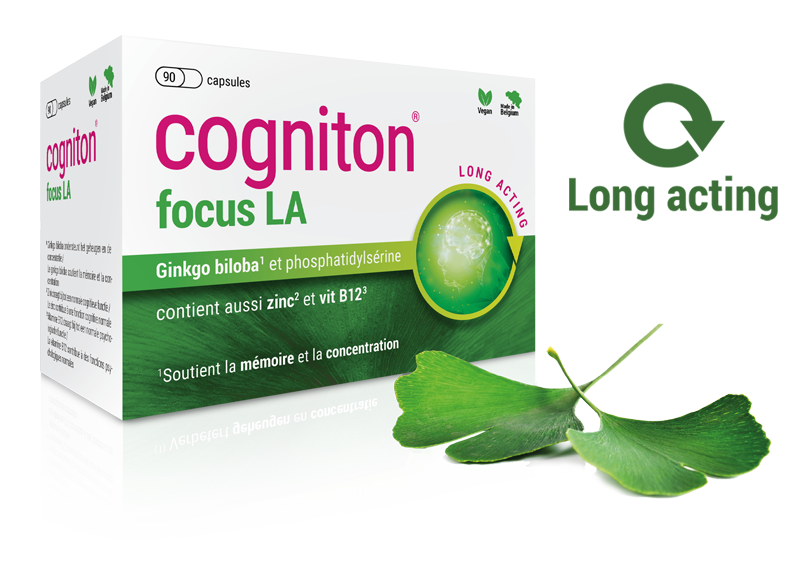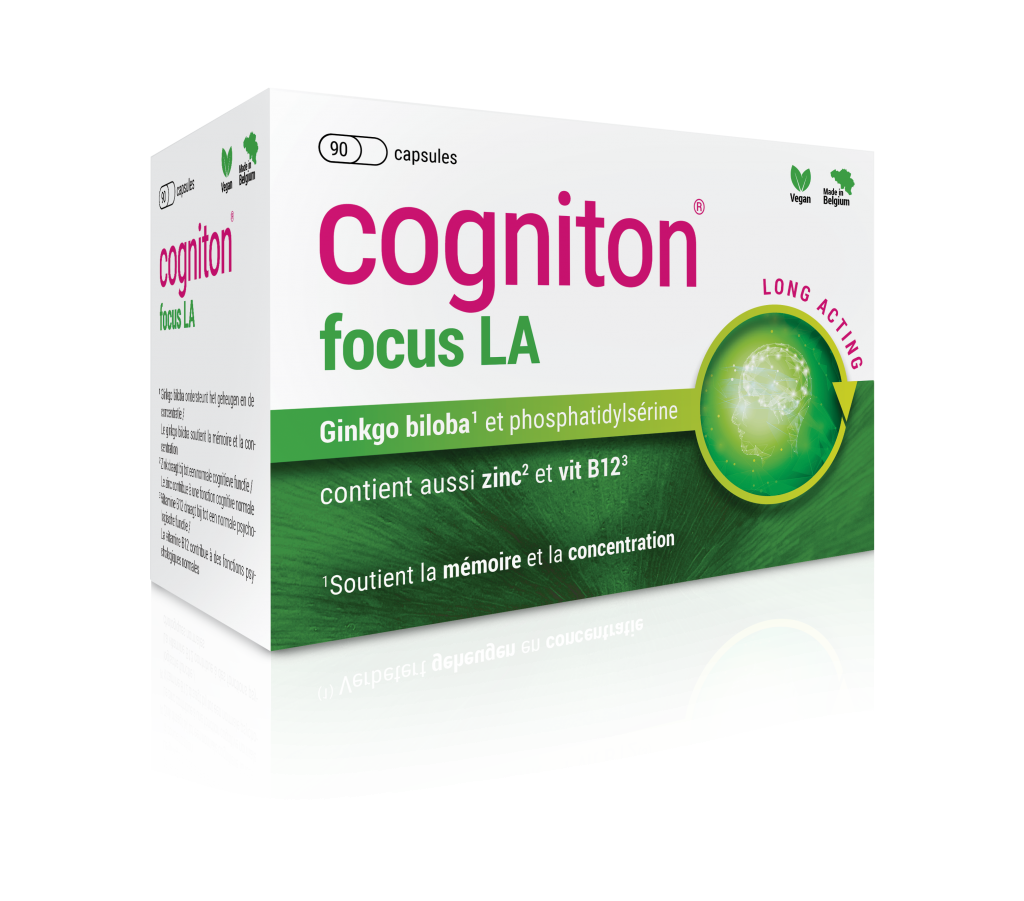 Cogniton focus ,Cogniton focus LA et Cogniton Plus Energy sont des compléments alimentaires, à consommer dans le cadre d'un mode de vie sain. Ils ne doivent pas être utilisés comme substituts d'un régime alimentaire varié et équilibré. (1) Le Ginkgo biloba soutient la mémoire et la concentration Le Ginkgo biloba aide au maintien d'une bonne fonction cognitive Le Ginkgo biloba aide à maintenir la mémoire avec le déclin de l’âge Le Ginkgo biloba contribue à une circulation sanguine normale associée à la performance cérébrale Le Ginkgo biloba aide à maintenir une bonne fonction cognitive, en contribuant à une circulation sanguine normale qui est associée aux performances et à la réactivité du cerveau. Le Ginkgo biloba aide à rester concentré au quotidien Le Ginkgo biloba aide à maintenir la mémoire malgré le déclin lié à l’âge et à préserver la fonction cognitive (2) Le zinc contribue à une fonction cognitive normale (3) La vitamine B12 contribue à des fonctions psychologiques normales. La vitamine B12 contribue au fonctionnement normal du système nerveux (4) Les vitamines B5 & B12 contribuent à un métabolisme énergétique normal et à réduire la fatigue La vitamine B5 contribue à la réduction de la fatigue et de l’épuisement. (5) Le sélénium contribue à la protection des cellules contre le stress oxydatif (6) Le guarana aide à se sentir plus énergique (7) Les vitamines B1, B6 et B12 contribuent au fonctionnement normal du système nerveux (8) Le zinc et la vitamine B5 contribuent à une fonction cognitive normale et à des performances intellectuelles normales (9) L’huperzia serrata soutient les fonctions mentales générales, telles que la mémoire et la vigilance.