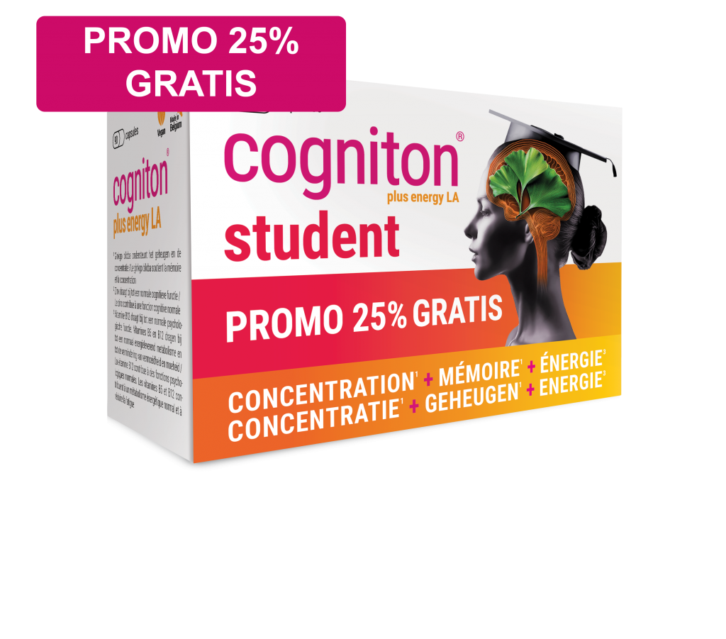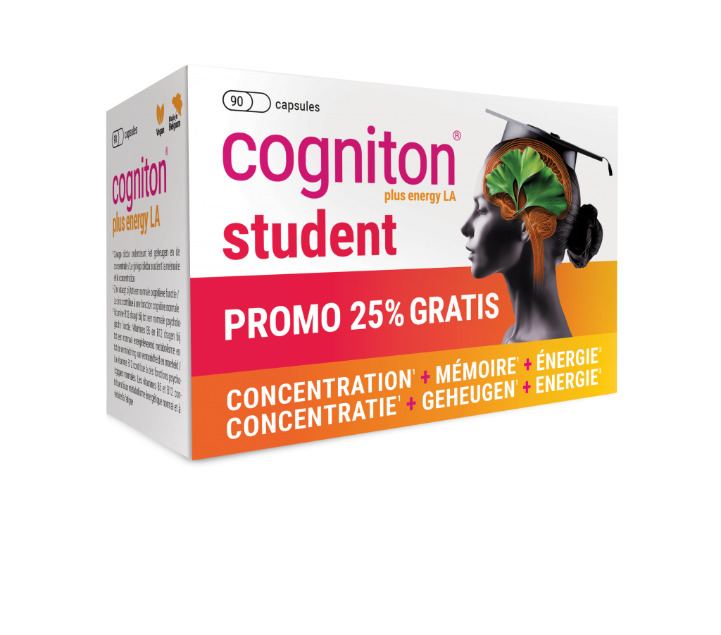 Cogniton plus energy LA convient aux étudiants et aux personnes actives qui souhaitent maintenir leur concentration afin d’être performant en période de stress et d’emploi du temps chargé1. Pensez aux examens ou à une période chargée au travail. À cette fin, des ingrédients ont été ajoutés pour maintenir l’énergie et aider à réduire la fatigue, à savoir notamment les vitamines B5 et B124. Ce produit contient également du Guarana..